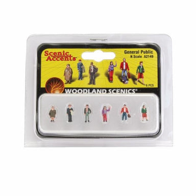 General Public - N scale A set of three women and three men. Two men are carrying briefcases and one is carrying a sweater. One woman is waving an...