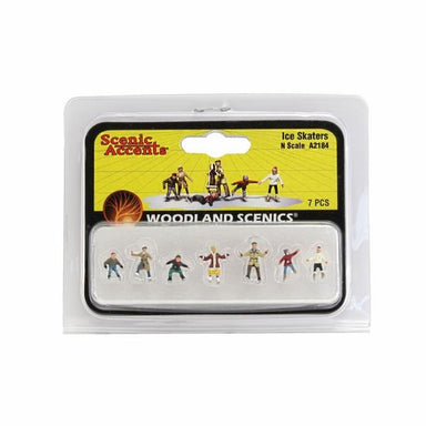 Ice Skaters - N scale A set of skaters. Six are on their feet and one has fallen and can’t get up. Set contains 7 pieces. Colors may vary from a...