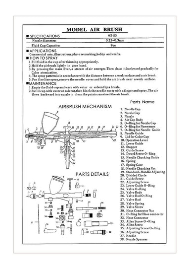 HS-80 Airbrush Kit Specifications: Nozzle Diameter: 0.25mmFluid Cup Capacity: 9cc0.2mm nozzle and needle0.3mm nozzle and needle0.5mm nozzle and nee...