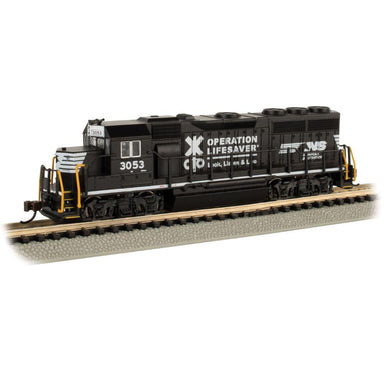 EMD GP40 Diesel Locomotive - NORFOLK SOUTHERN OPERATION LIFESAVER #3053 (with dynamic brakes) - N Scale. The EMD GP40 diesel locomotive was built by General Motors Electro-Motive Division between November 1965 and December 1971. Powered by an EMD 645E3 16-cylinder engine which generated 3000 horsepower the GP40 has proven itself as a standard freight engine on railroads throughout North America. This Bachmann model features a highly detailed body, operating directional dimming (Rule 17) headlights, All-wheel electrical pickup and drive, Skew wound motor with bronze bearings, Die-cast chassis, and Performs best on 11.25" radius curves or greater.
