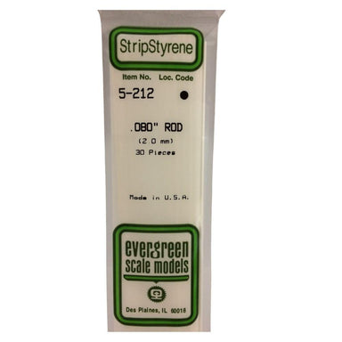 Package Contains Six .080" White Styrene Plastic Round Rods from Evergreen Scale Models.FEATURES: Solid white styrene round rods are sturdy and dur...